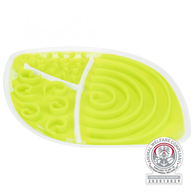 Schlecken entspannt Hunde und sorgt für Ruhephasen. Ein optimales Hilfsmittel für diesen Zweck ist die Lick'n'Snack Schleckplatte: Durch die kleinen Öffnungen bzw. Rillen nimmt dein Vierbeiner nur kleine Mengen an Snacks auf einmal zu sich und ist lange beschäftigt. Du kannst die Platte mit unterschiedlichen Pasten und Molkereiprodukten oder auch Nassfutter bestreichen, die dein Hund anschließend genüsslich ausschlecken darf.
